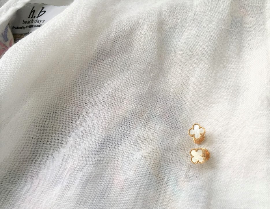 アクセサリーは、Vancleef&Arpelsのアルハンブラ×白蝶貝のミニサイズ。